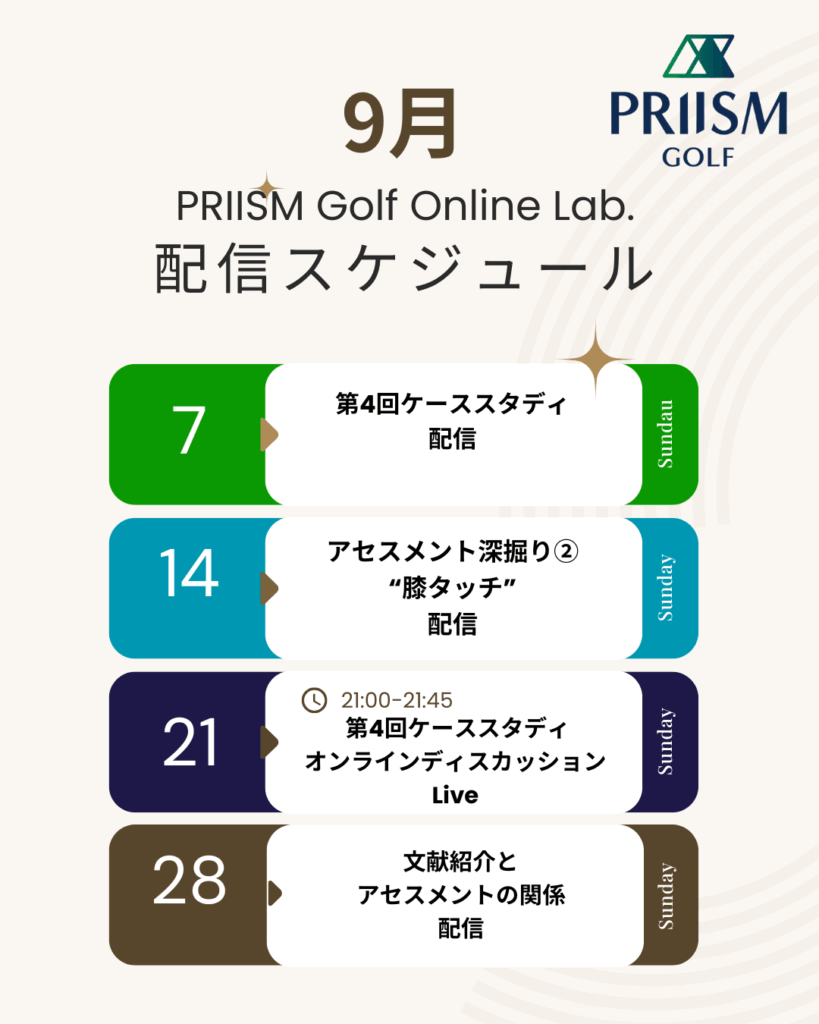 📢 PRIISM Golf Online Lab. 2025年9月配信スケジュール コメントする / スケジュール / By Isamu 皆様、暑い日が続きますがいかがお過ごしでしょうか? 9月も残暑に負けずコンテンツをお届けさせていただきます 引き続きPRIISM Golfをよろしくお願いいたします!
